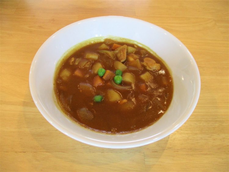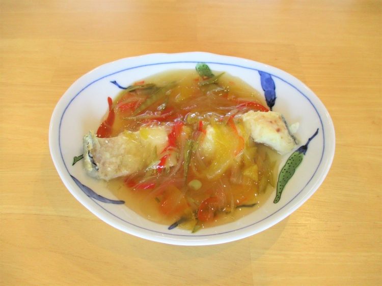 ご飯、棒麩のみそ汁、白身魚の野菜あんかけ、ブロッコリーと帆立のスープ煮、小松菜のソテー、