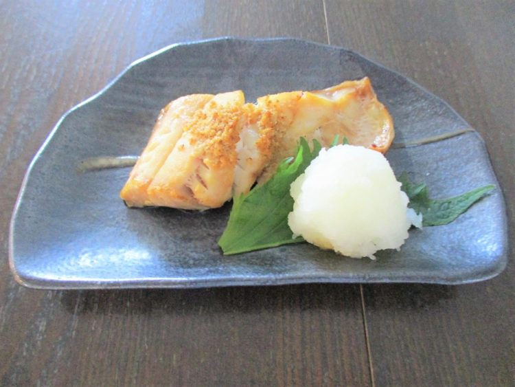 ご飯、もやしのみそ汁、白身魚の生しょうゆ糀焼き、さといもの煮物、小松菜のお浸し、