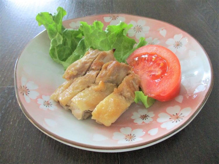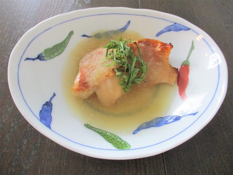 ご飯、花麩のすまし汁、たらのマスタードソースがけ、いんげんのソテー、春菊の白和え、