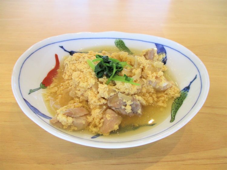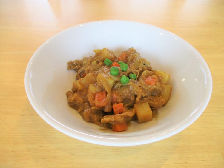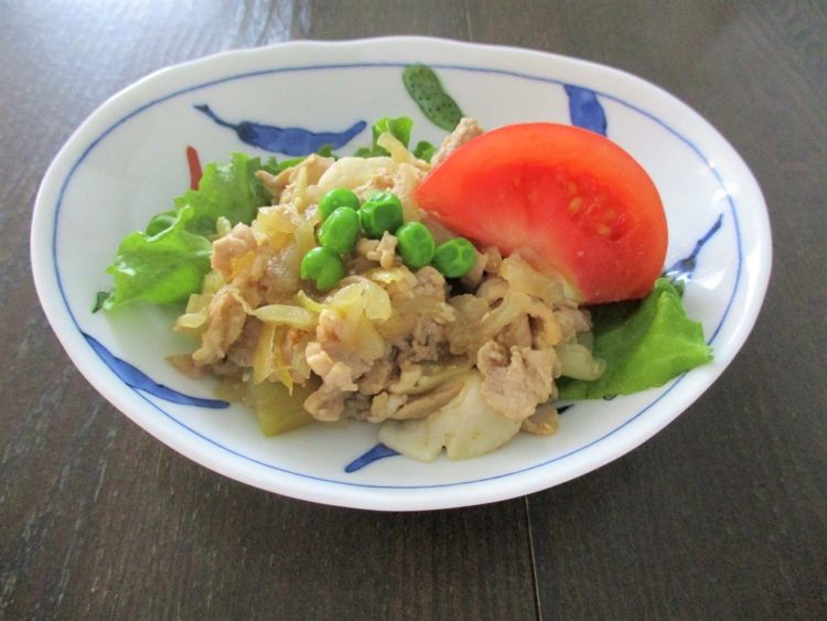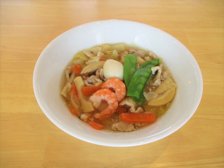 ご飯、きのこスープ、ポークオニオンソテー、冬瓜のかにあんかけ、ほうれん草のお浸し、
