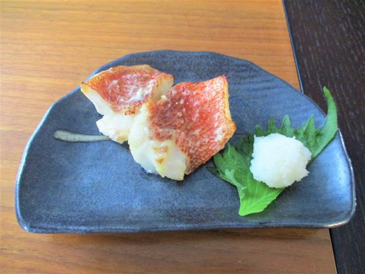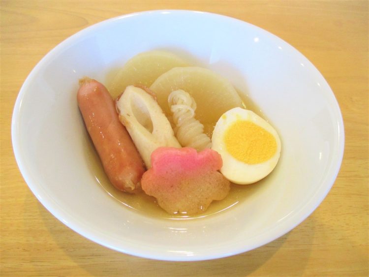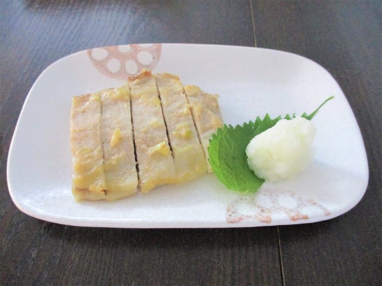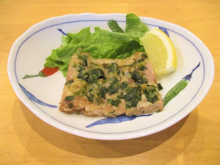 ご飯、かまぼこのすまし汁、鮭のチャンチャン焼き風、しそ巻棒餃子、大根のなめこあんかけ、