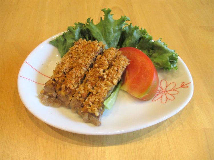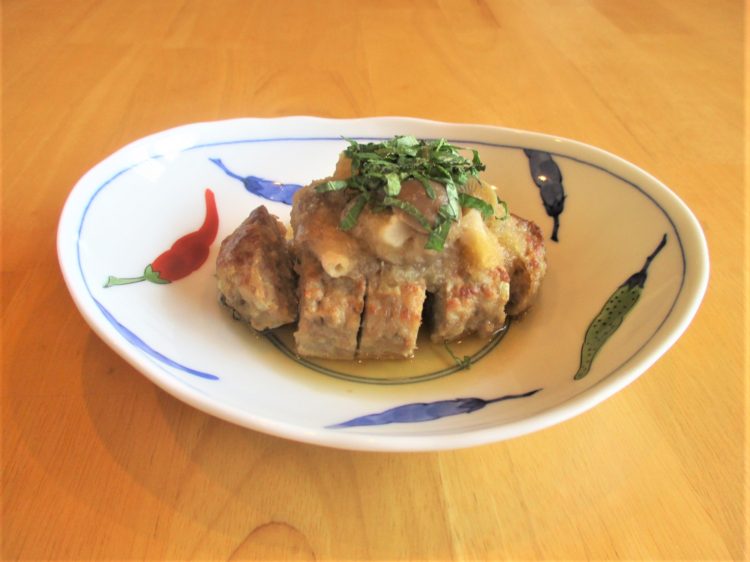 ご飯、板麩のみそ汁、和風おろしハンバーグ、メンマのソテー、なすと高野豆腐の生姜煮、