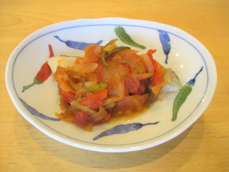 ご飯、もやしのみそ汁、たらのトマトソースがけ、キャベツのソテー、レンコン金平、
