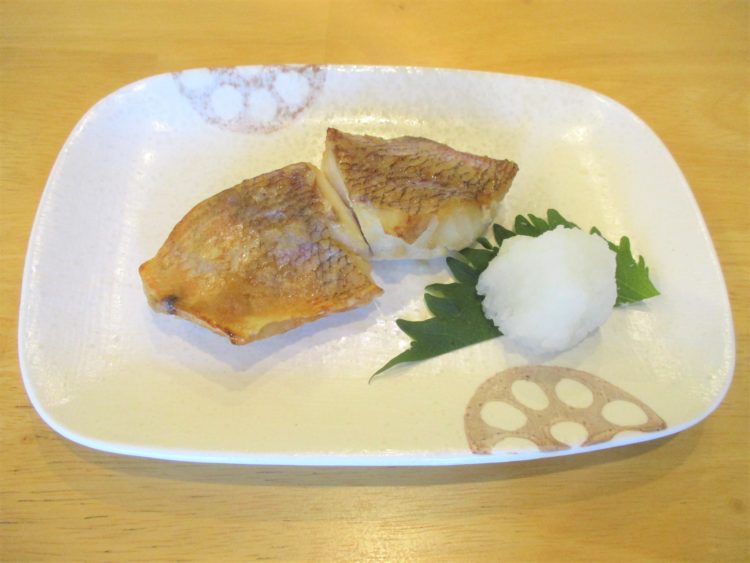 ご飯、花麩のすまし汁、赤魚のしょうゆ糀焼き、セロリのソテー、オクラとなめこ和え、