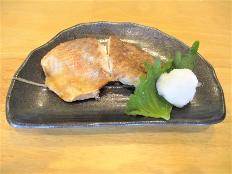 ご飯、豆腐のみそ汁、メバルの山椒風味焼き、ごぼうの鶏そぼろ煮、もやしとイカの炒め物、