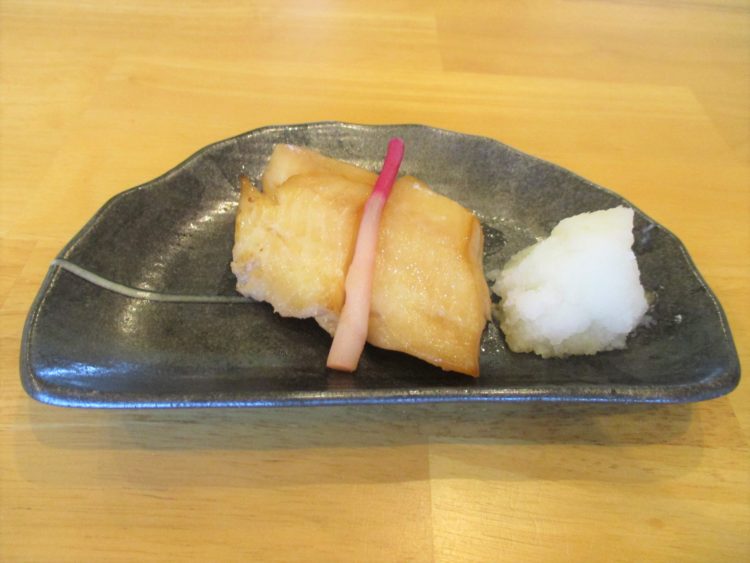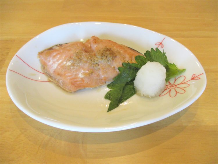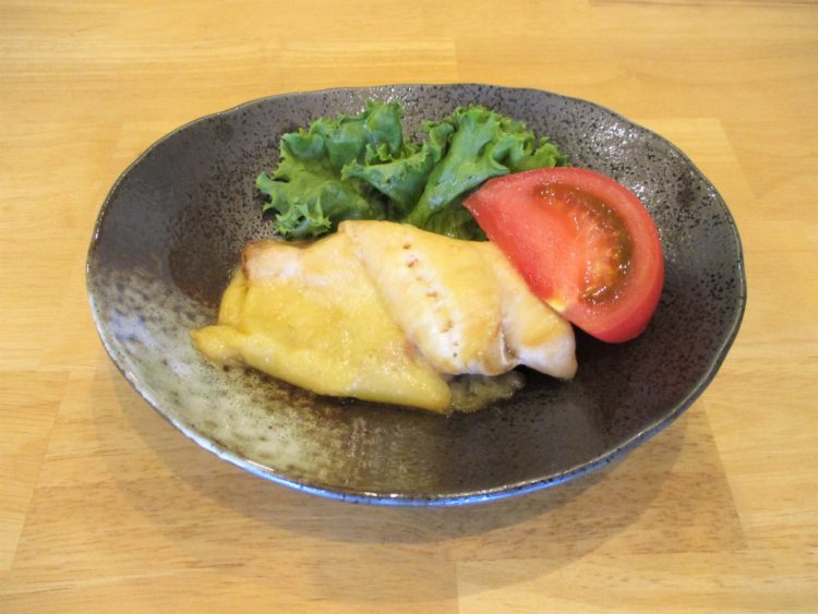 ご飯、花麩のみそ汁、かれいのみりん漬け焼き、なすの揚げ浸し、めかぶの和え物、
