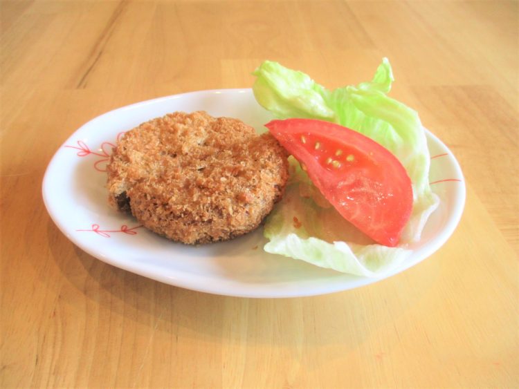 ご飯、えのきのみそ汁、チーズ入りメンチカツ、ふきの炒め物、白菜のお浸し、