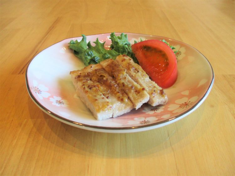 ご飯、観世麩のすまし汁、ポークマスタード焼き、大根のあんかけ、いかの酢の物、