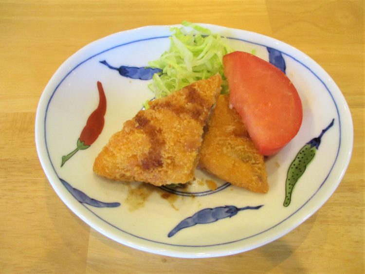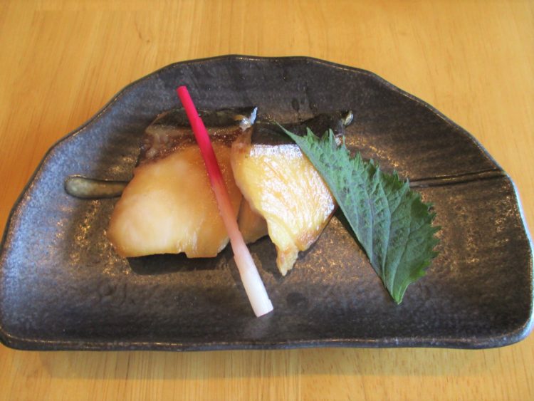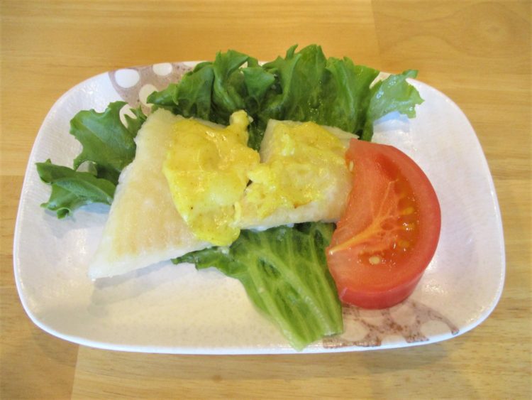 ご飯、舞茸のみそ汁、カレイのカレー風味焼き、人参の子和え、里芋の田楽、