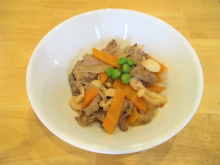 ご飯、きくらげのスープ、牛肉と玉ねぎのソテー、ふろふき大根、野菜しゅうまい、