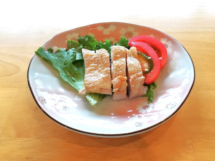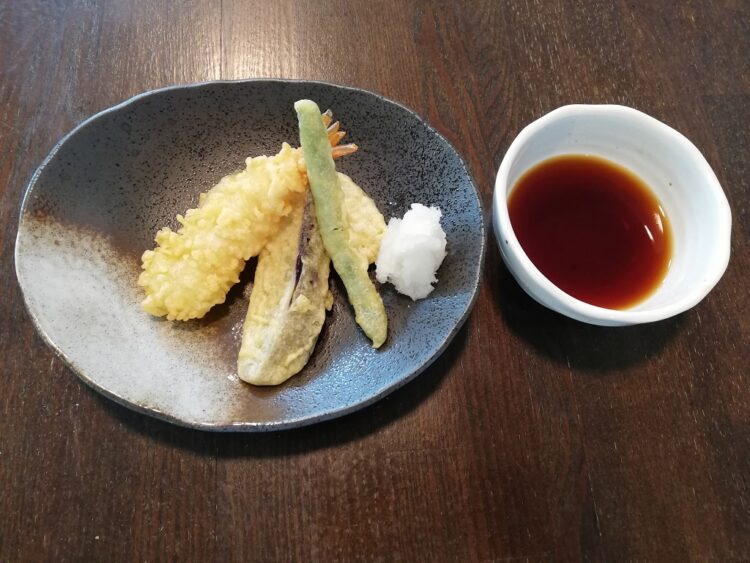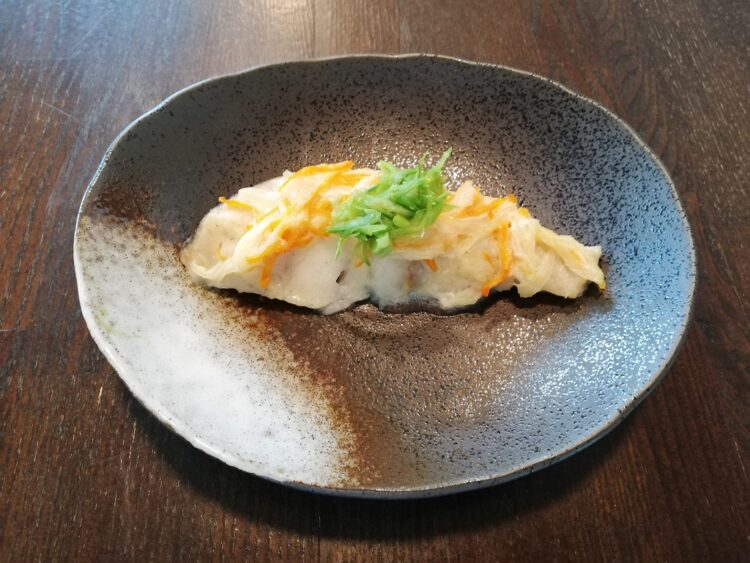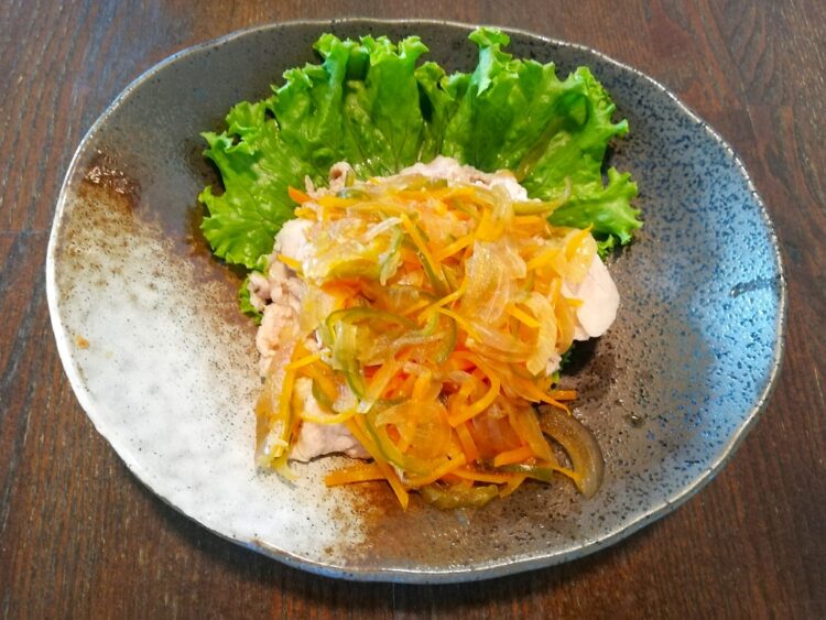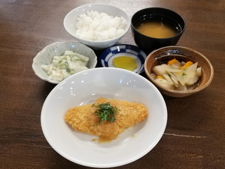 ごはん、舞茸のみそ汁、白身魚と野菜のうま焼き、青梗菜の炒め物、さつま芋のサラダ、しば漬け