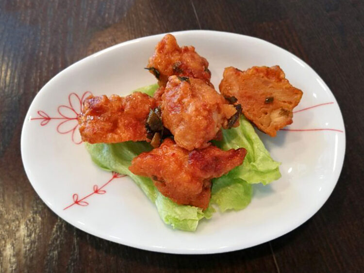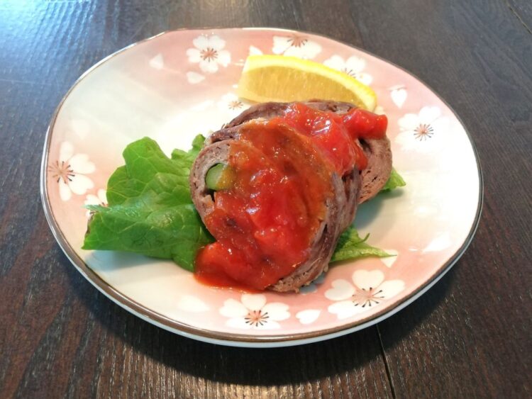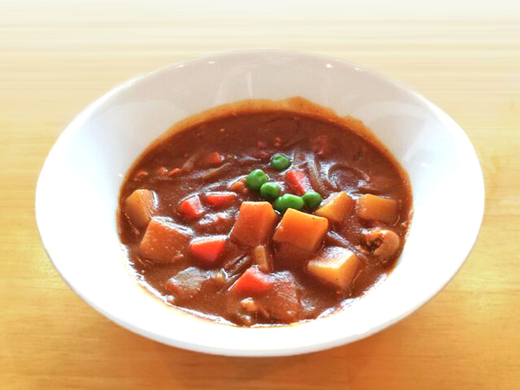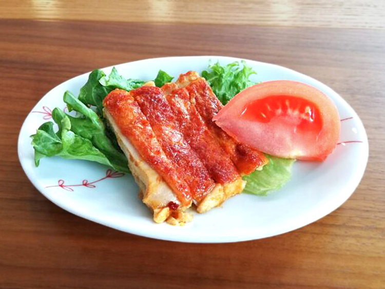 ごはん、もやしのみそ汁、豚肉の青じそ風味焼き、冬瓜のあんかけ、ポテトサラダ、のり佃煮