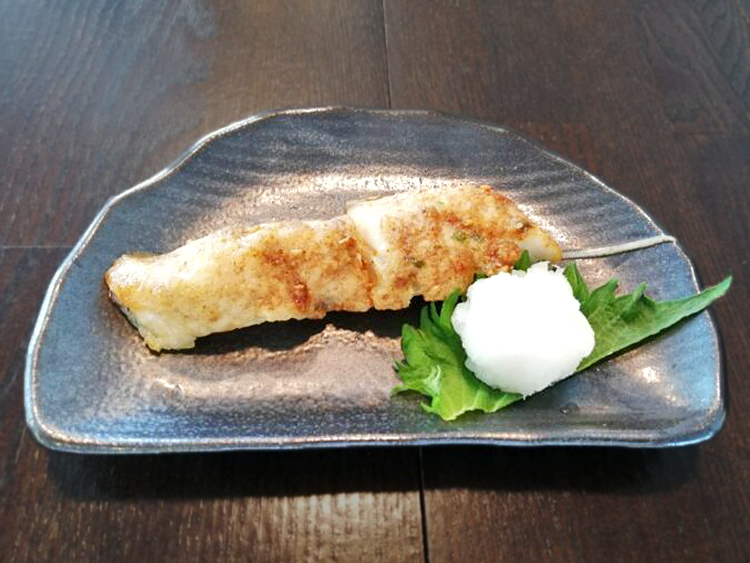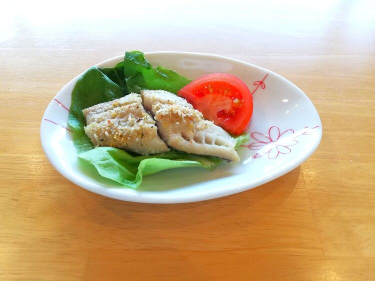 ごはん、しめじのみそ汁、たらの香草パン粉焼き、キャベツの炒め物、マカロニサラダ、しば漬け