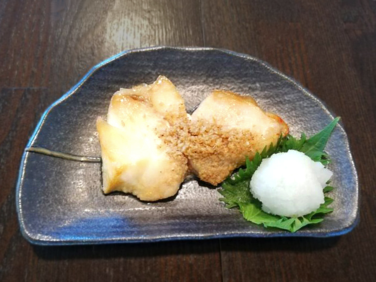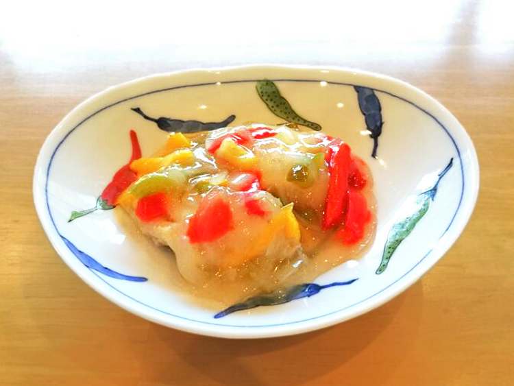 ごはん、岩海苔のみそ汁、白身魚の野菜あんかけ、小松菜のソテー、マカロニサラダ、しその実漬け
