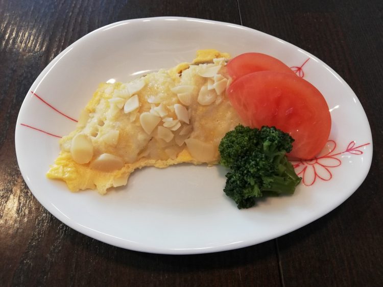 ごはん、なめこのみそ汁、たらのアーモンドチーズ焼き、がんもの煮つけ、アスパラサラダ、