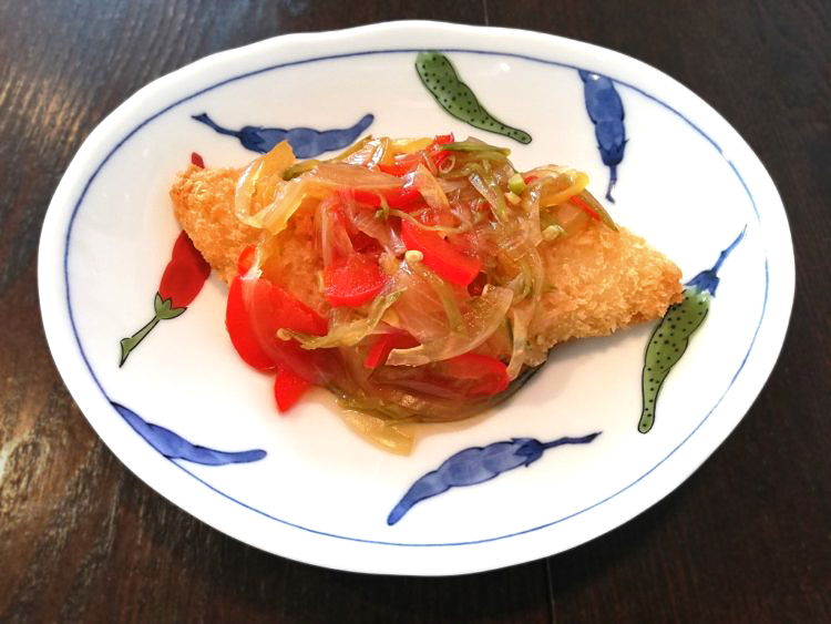 ごはん、小大豆もやしのみそ汁、白身魚のカレー風味焼き、かぶの煮物、春巻き、赤かぶ漬け