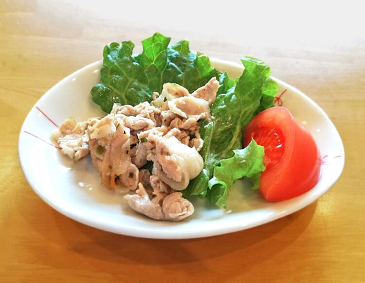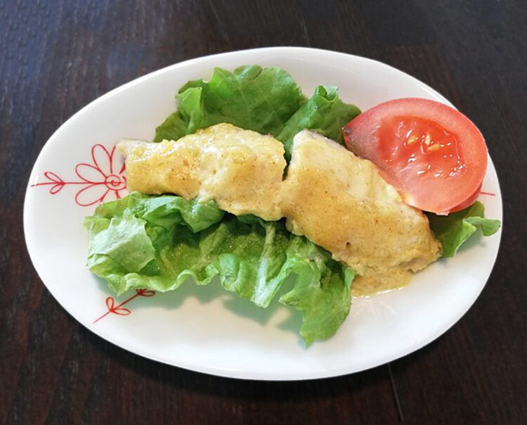 ごはん、わらびのみそ汁、白身魚の甘酢あんかけ、玉子と豆腐のしんじょ、レタスのサラダ、