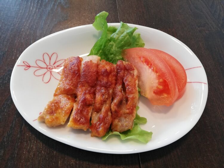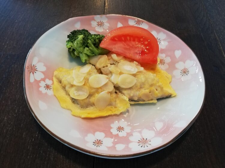 ごはん、なめこのみそ汁、たらのアーモンドチーズ焼き、がんもの煮つけ、アスパラサラダ、