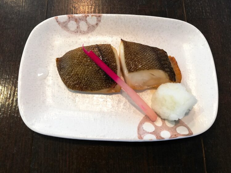 ごはん、うどん汁、カレイみりん漬け焼き、なすの揚げ浸し、ずんだ和え、桜大根漬け
