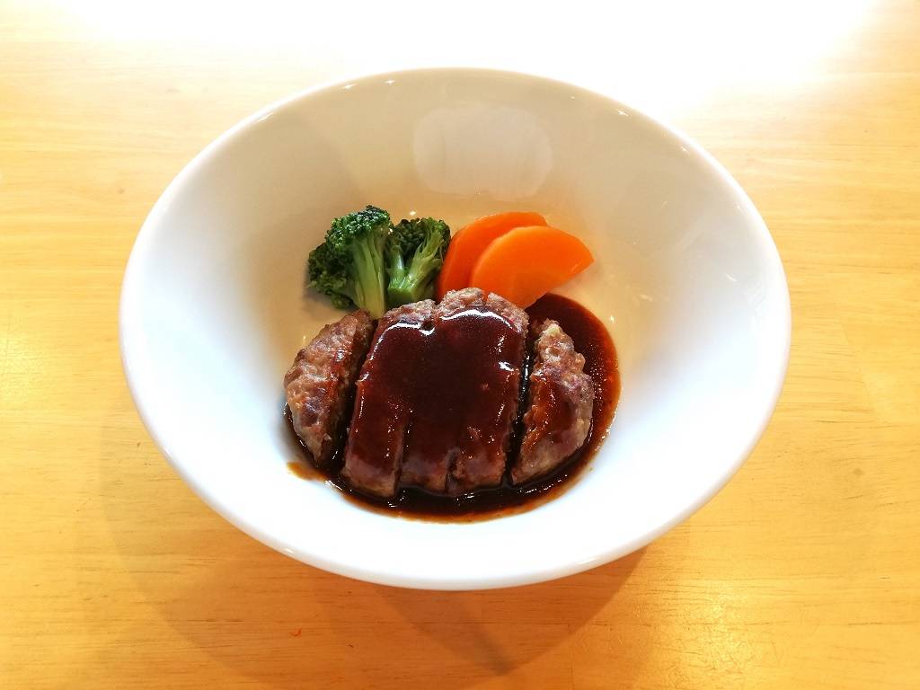 ごはん、キャベツのスープ、ハンバーグデミソース、すき昆布の煮物、マカロニサラダ、