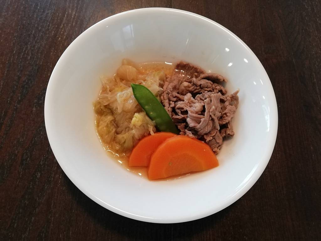 ごはん、大根のみそ汁、牛肉と白菜のすきやき風、コーンしゅうまい、青梗菜のお浸し、