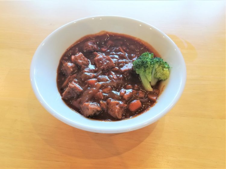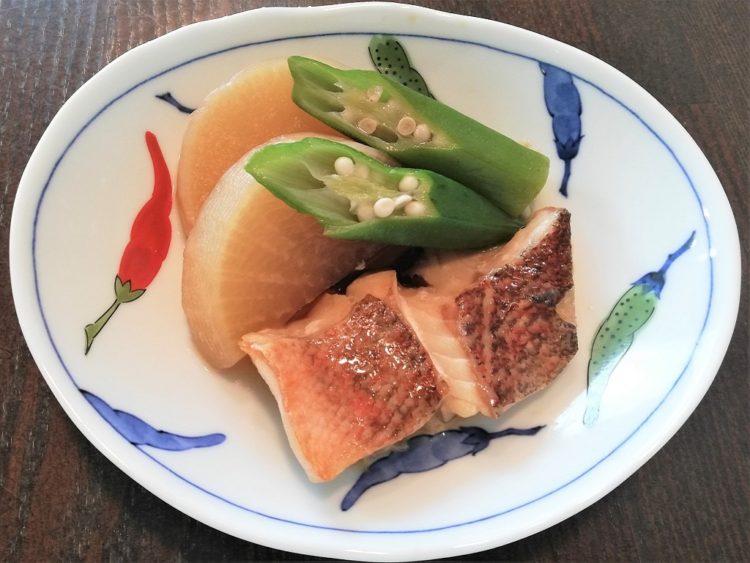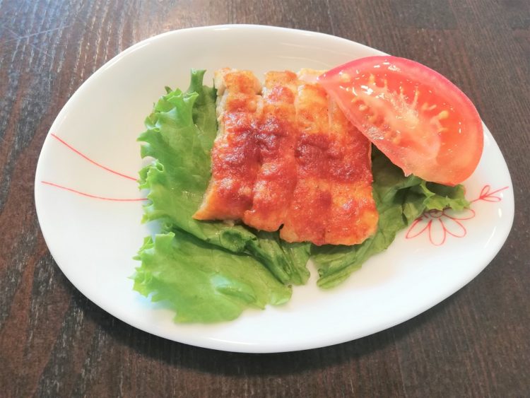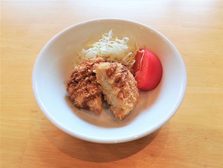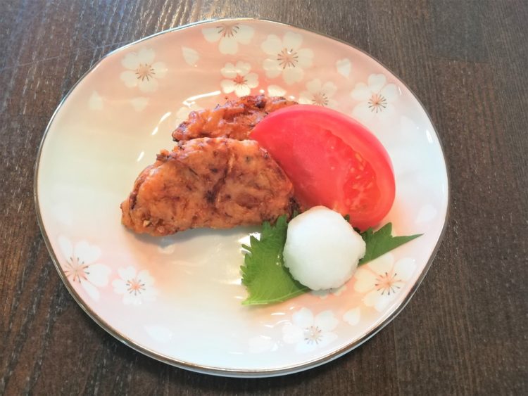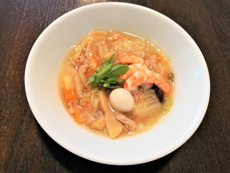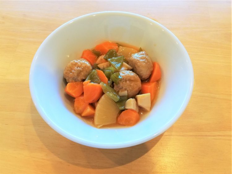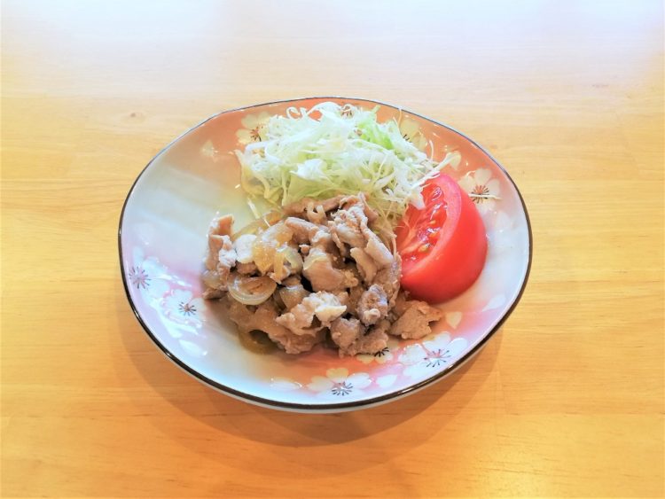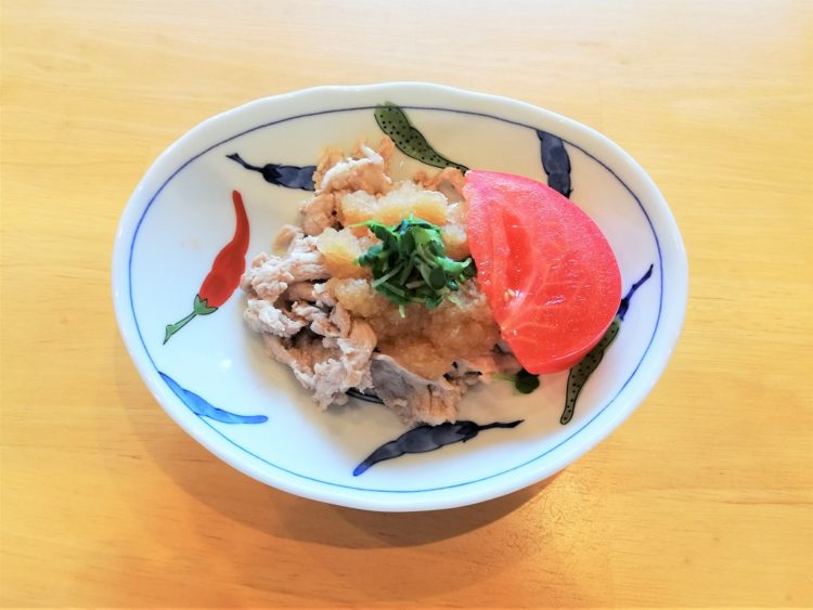 ご飯、わかめのスープ、豚肉のおろしポン酢がけ、かぼちゃの煮物、マカロニサラダ、