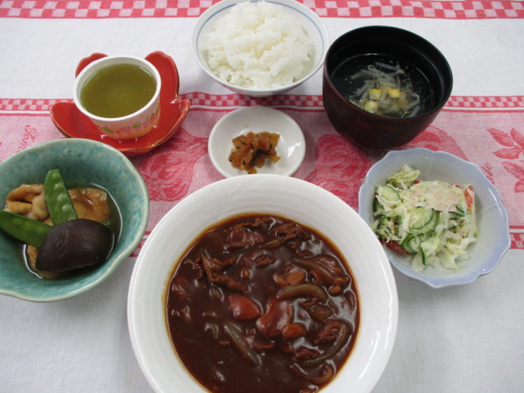 ご飯、もやしとコーンのスープ、薄切り牛肉のハヤシライス、ツナサラダ、五目巾着の含め煮、福神漬、青りんごゼリー