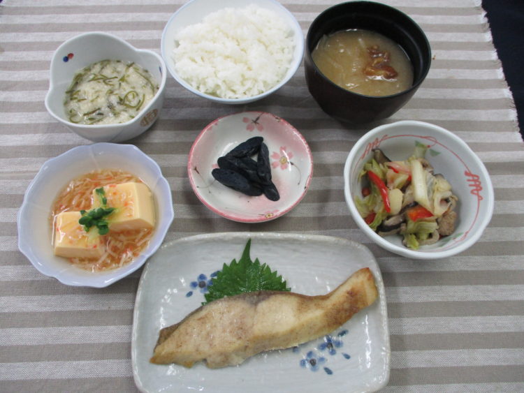 ご飯、豆腐と三つ葉の清汁、さわらのごま味噌焼き、南瓜と笹かまの炊き合わせ、つくね串、