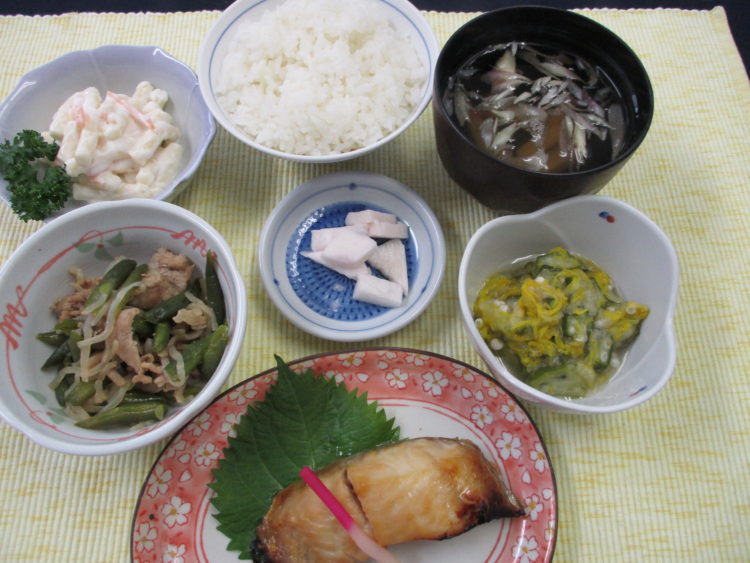 ご飯、花麩と三つ葉の清汁、シルバーの味噌マヨネーズ焼き、いんげんとベーコンのソテー、揚げ出し豆腐、胡瓜とくらげの中華和え、キャベツ漬