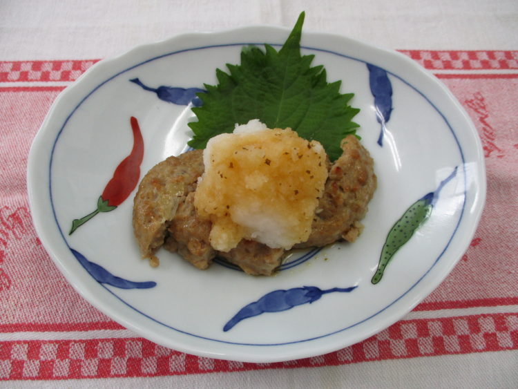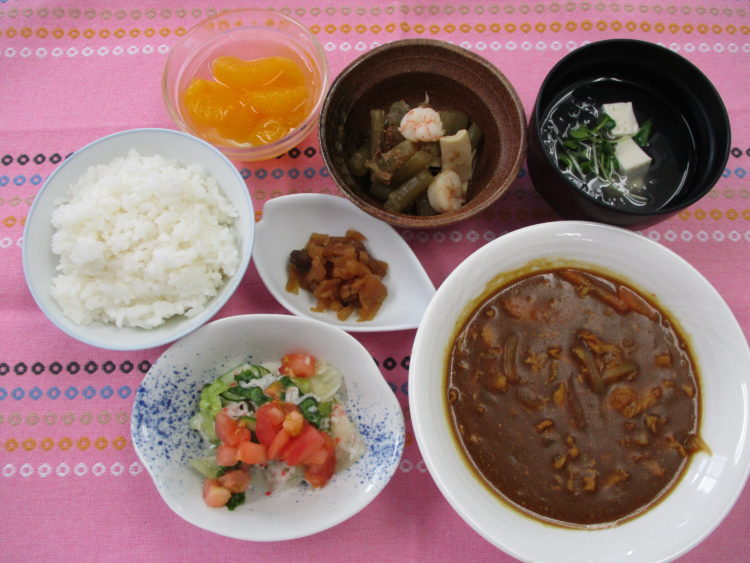 ご飯、白菜と板麩のみそ汁、帆立とがんもの煮物、オクラと菊のおろし和え、とうもろこしのつまみ揚げ、のり佃煮