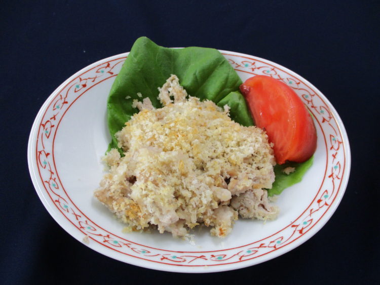ご飯、わらびと油揚げのみそ汁、たらの味噌マヨネーズ焼き、カリフラワーのスープ煮、えびしゅうまい、つぼ漬、ラフランスゼリー