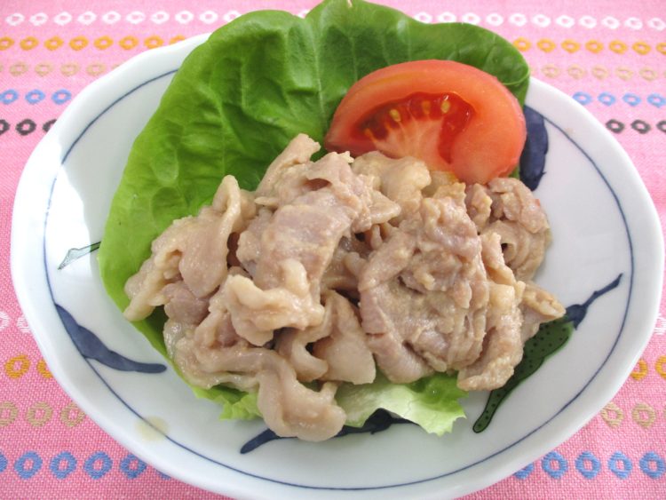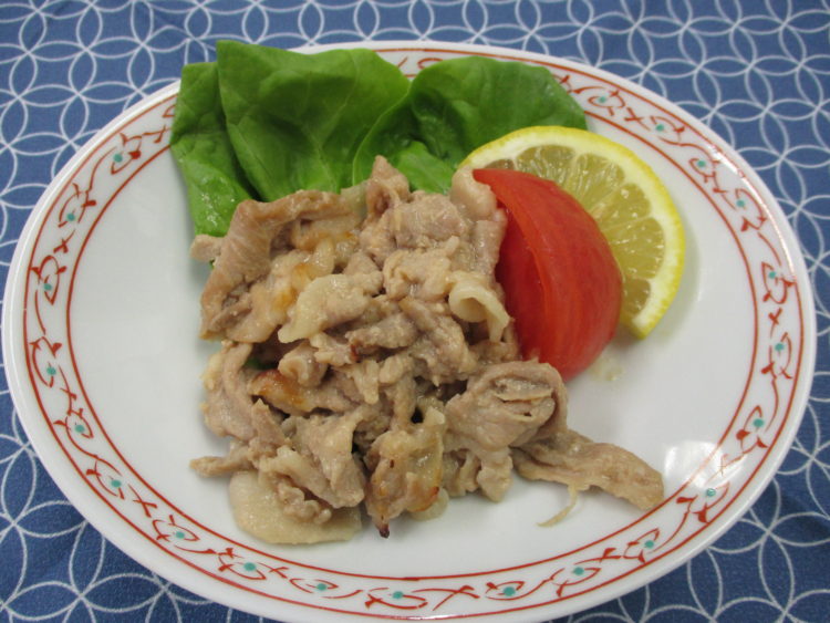 ご飯、ほうれん草と板麩のみそ汁、豚肉のバター醬油焼き、卯の花といかの炒り煮、みずの塩昆布和え、枝豆のふっくら揚げ、長芋漬
