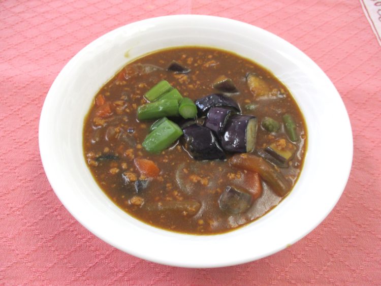 ご飯、もずくとねぎの清汁、なすとひき肉のカレー、コーンサラダ、かぶと椎茸の含め煮、