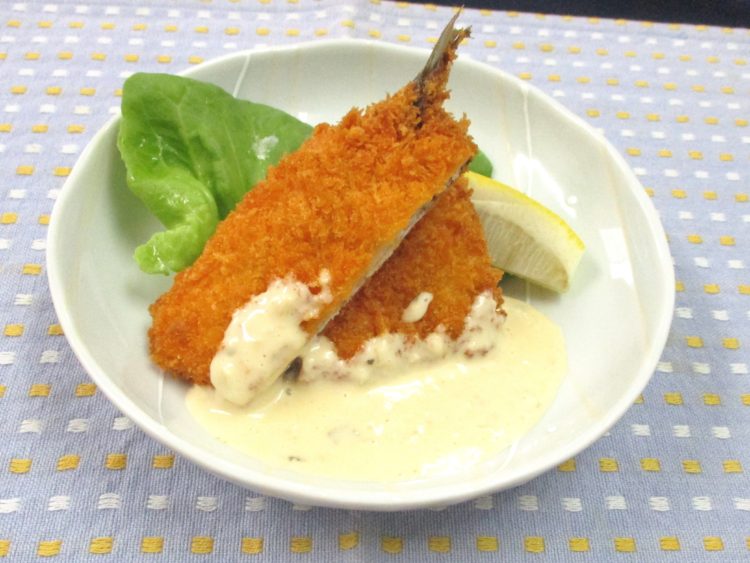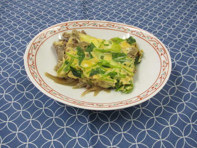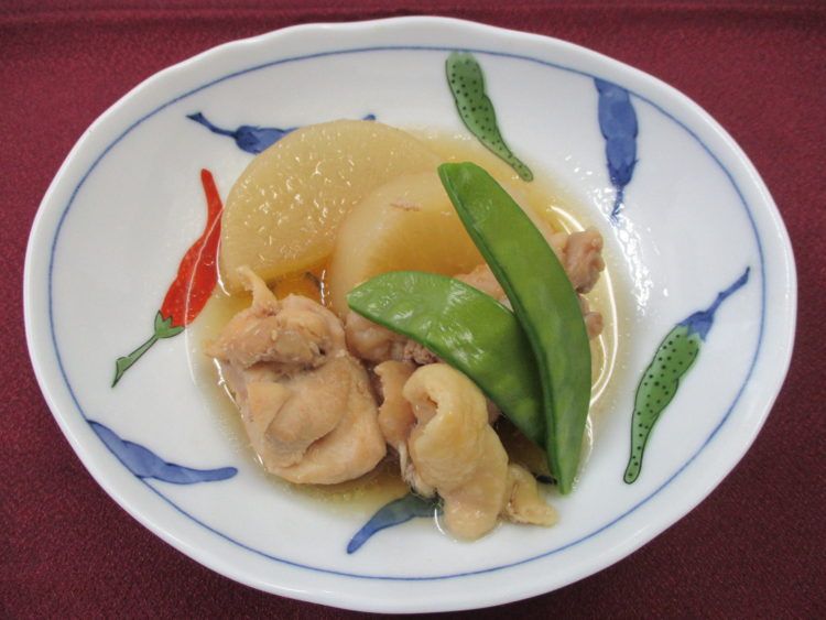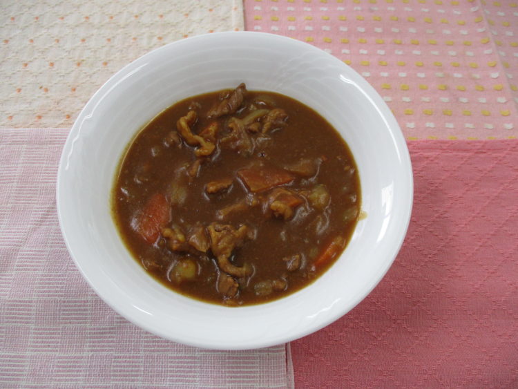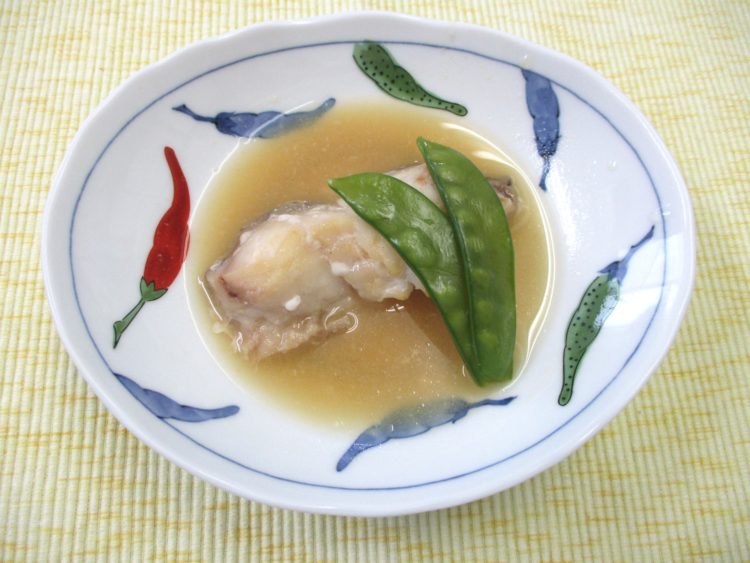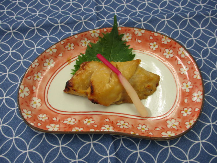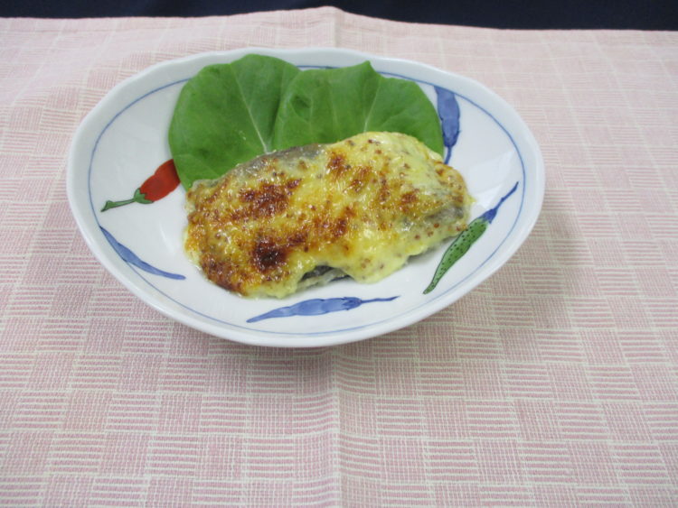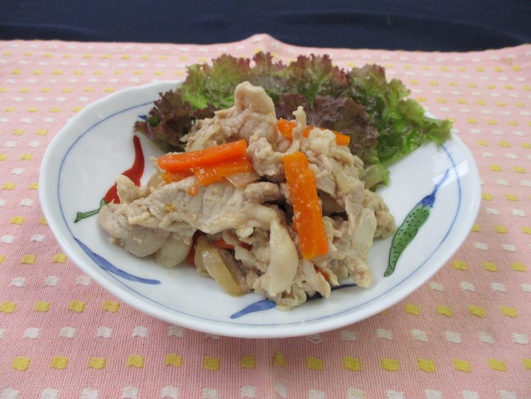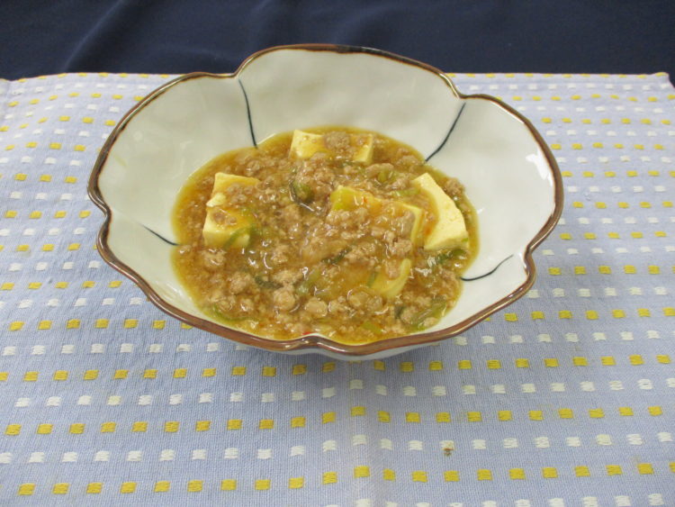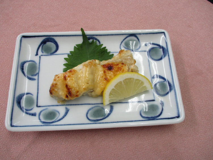 ご飯、豆腐と三つ葉の清汁、たらの味噌マヨネーズ焼き、いんげんと豚肉の炒め物、カリフラワーのスープ煮、しそ昆布、パイン缶