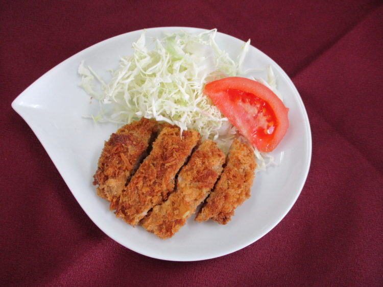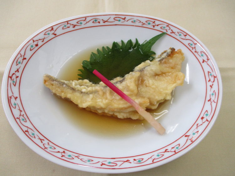ご飯、なるとと三つ葉の清汁、かぶと帆立の煮物、かつおフライ、オクラとおかかの和え物、梅吹雪漬