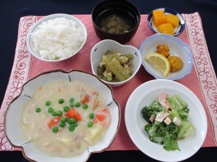 ご飯、きのこスープ、チキンクリームシチュー、シーザーサラダ、とうもろこしのつまみ揚げ、ふきと湯葉の含め煮、マンゴー