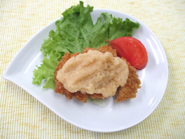 ご飯、なすといんげんのみそ汁、とんかつおろしポン酢、カリフラワーとえびのカレー炒め、