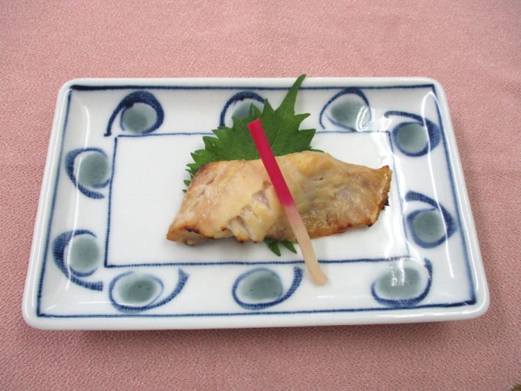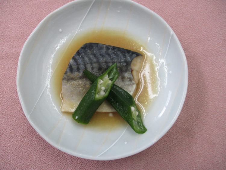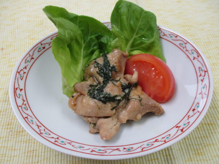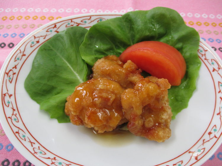 ご飯、はんぺんと三つ葉のみそ汁、鶏の竜田揚げ甘酢あんかけ、ブロッコリーといかのソテー、小松菜のなめ茸和え、杏しそ巻、日向夏ゼリー