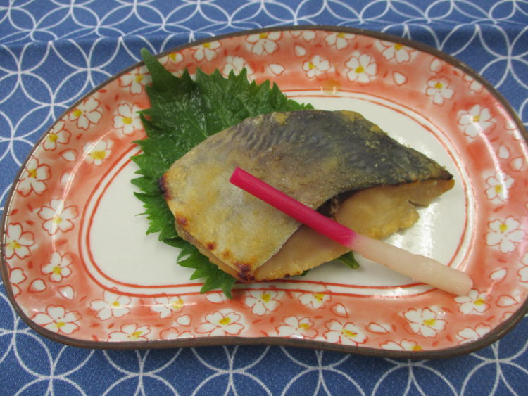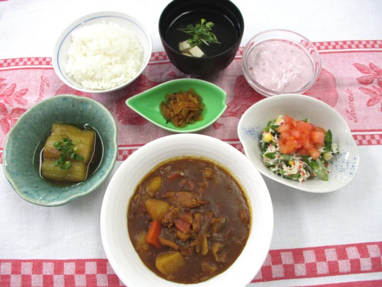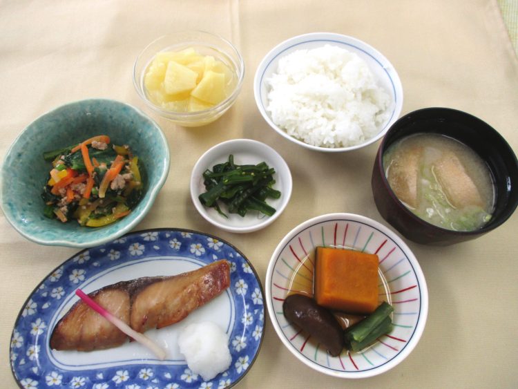 ご飯、もやしと油揚げのみそ汁、たらのタルタルソースがけ、ブロッコリーとコーンのソテー、きゅうりのなめ茸和え、ごま豆腐、野沢菜漬