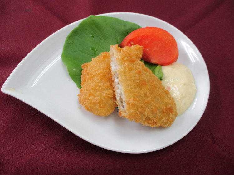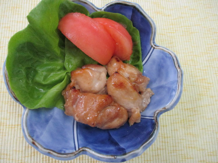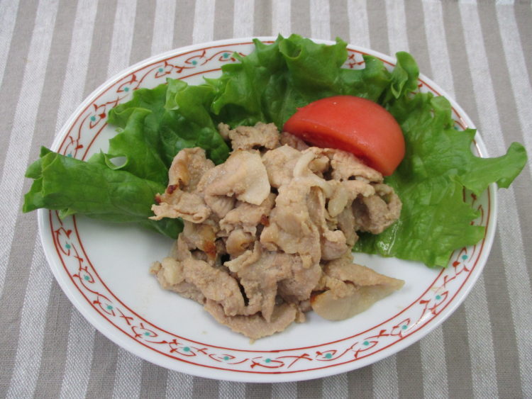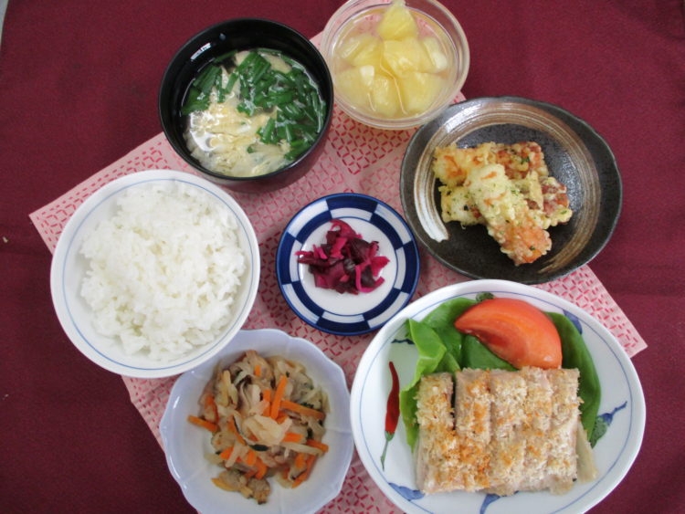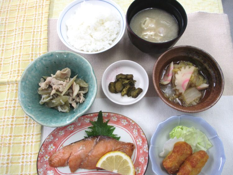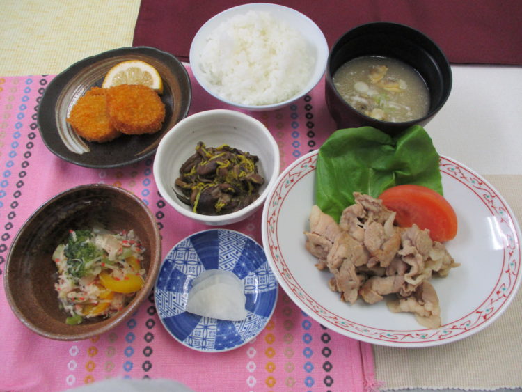 ご飯、舞茸とねぎのみそ汁、豚肉のオイスターソース焼き、いんげんとツナのソテー、焼き茄子の生姜煮、わかめ磯漬、ぶどうゼリー