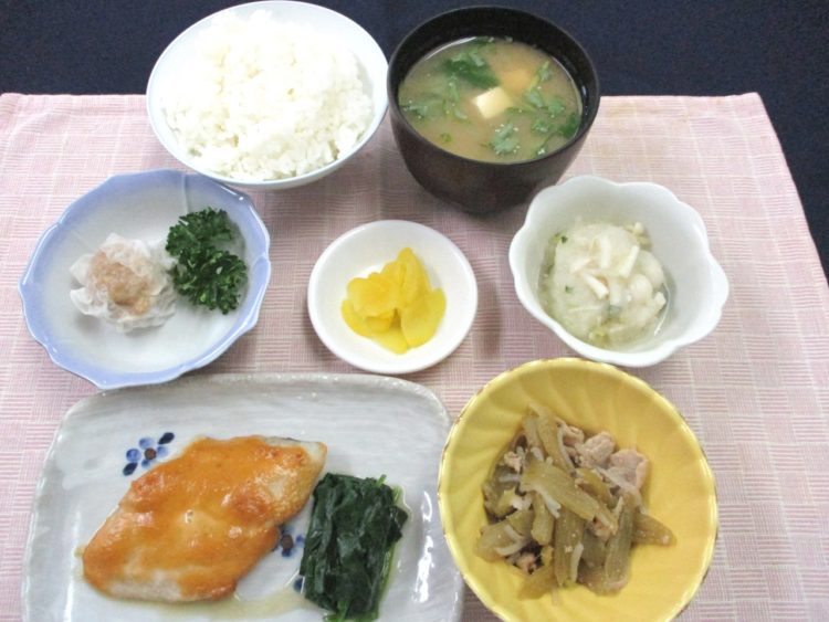 ご飯、豆腐と三つ葉のみそ汁、さわらの味噌マヨネーズ焼き、ふきと豚肉の炒め物、
