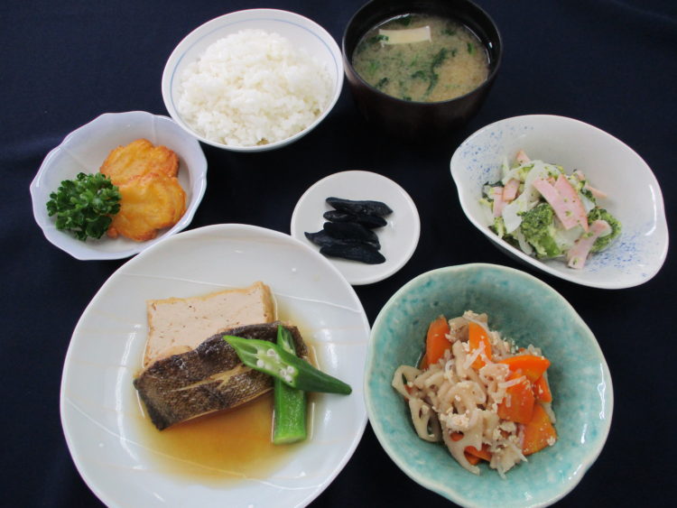 ご飯、小松菜と板麩のみそ汁、かれいと生揚げの煮付け、れんこんのそぼろ炒め、チキンナゲット、ブロッコリーとハムのサラダ、なす漬