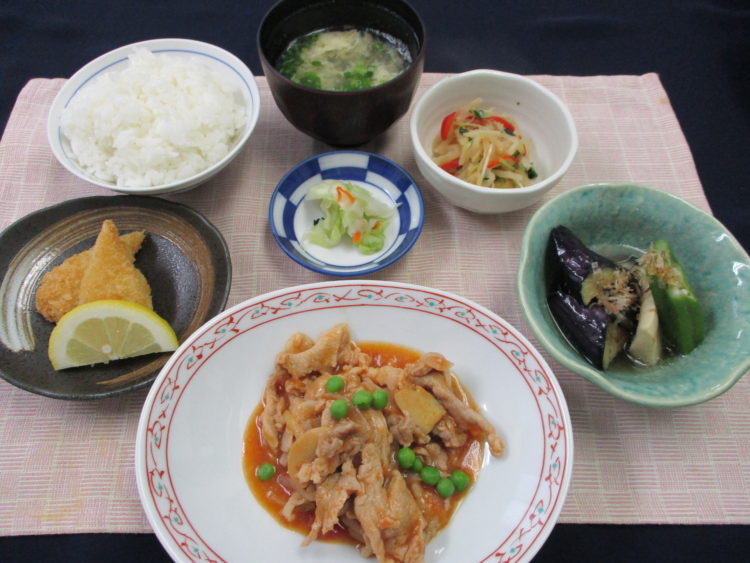 ご飯、かき卵汁、豚肉のトマトソース煮、なすと高野豆腐の煮つけ、イカフライ、はりはりサラダ、キャベツ漬