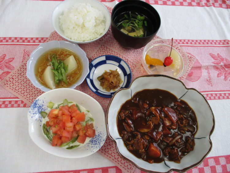 ご飯、豆腐とかいわれのスープ、薄切り牛肉のハヤシライス、アスパラとえびのサラダ、かぶのかにあんかけ、福神漬、フルーツみつ豆