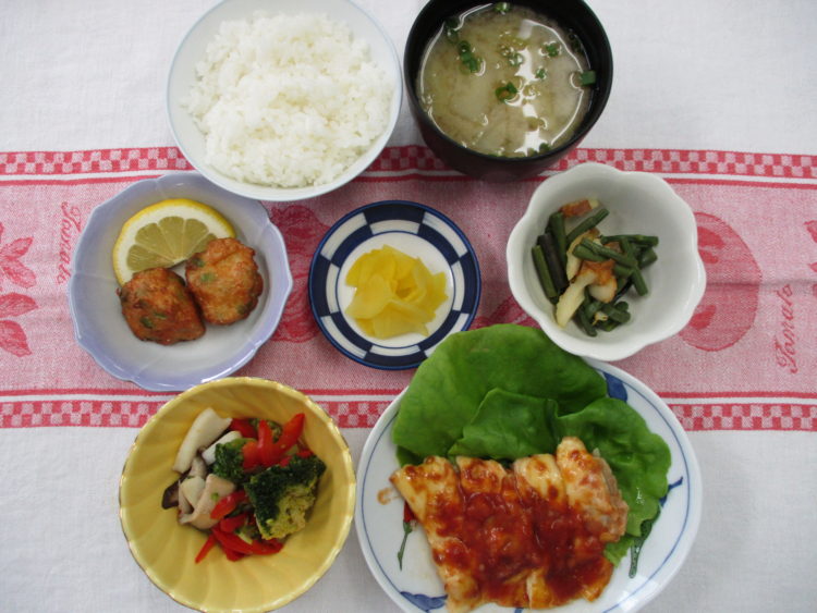 ご飯、もやしとわかめのみそ汁、鶏肉のサルサソースかけ、ブロッコリーと帆立のスープ煮、春巻き、身欠きにしん酢味噌和え、青じその実漬