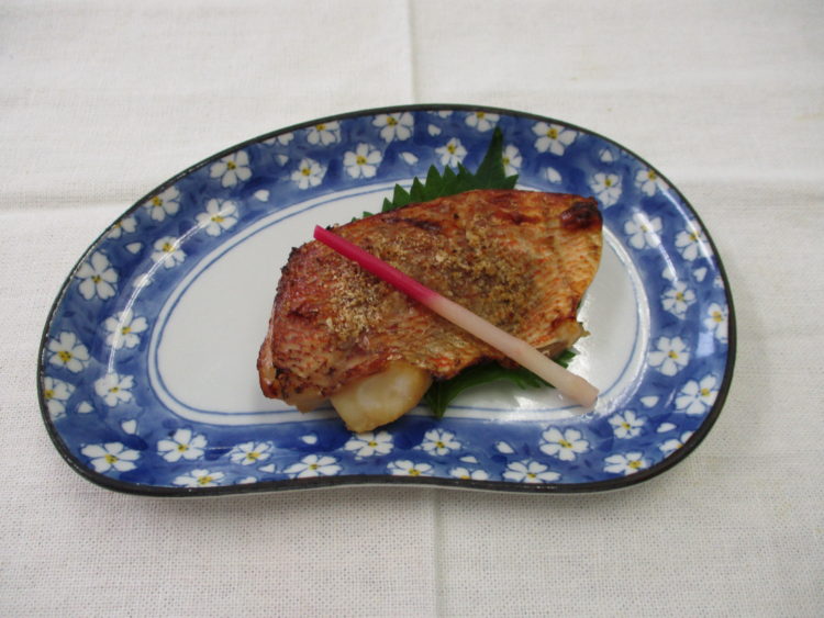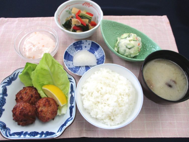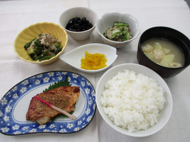ご飯、焼き豆腐と万能ねぎのみそ汁、かれいの煮付け、なすのケチャップ炒め、コーンしゅうまい、大根と水菜のしらす和え、きゃべつ漬