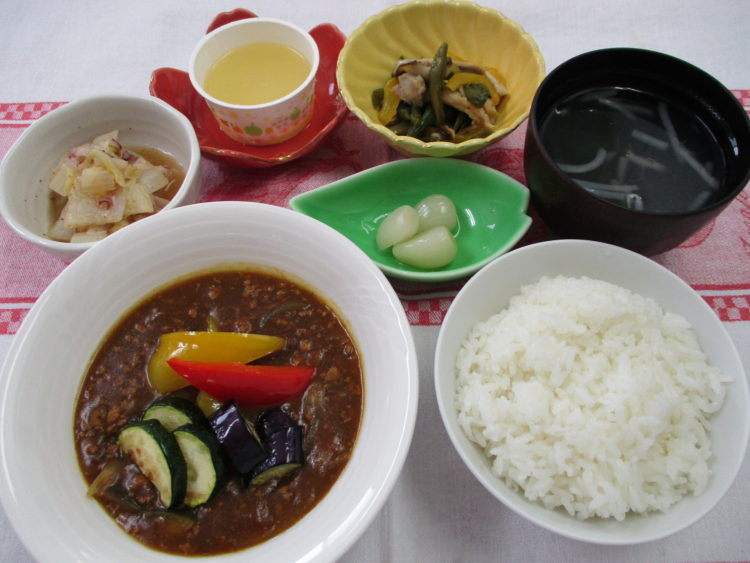 ご飯、なすと油揚げのみそ汁、ポークケチャップソテー、じゃが芋と帆立の煮物、春雨サラダ中華風、オクラとぶなピーのおろし和え、のりつくだ煮