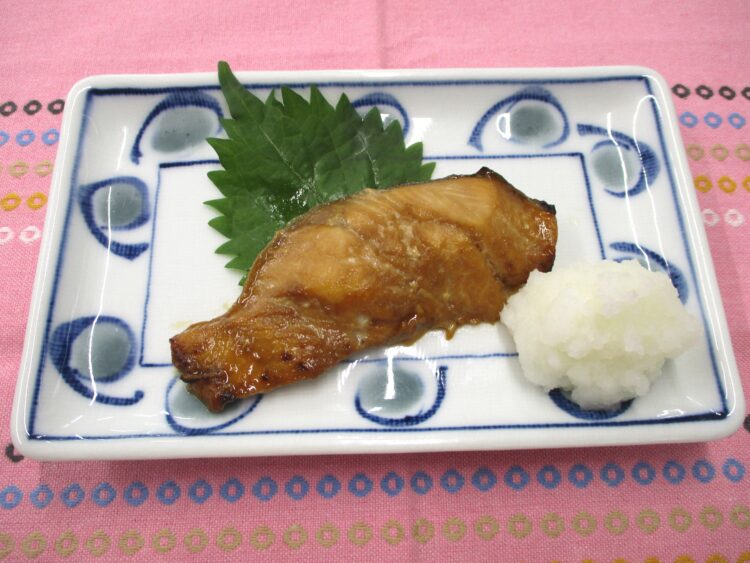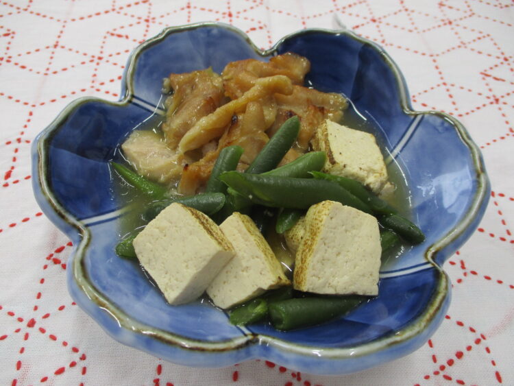 ご飯、ほうれん草と板麩のみそ汁、鶏肉のピーナッツ焼き、大根とあさりの炒め物、なすと高野豆腐の生姜煮、青じその実漬、みかんゼリー