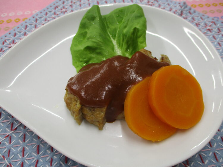 ご飯、かきたま汁、ハンバーグデミソース、生揚げと小松菜の煮物、わかめとみょうがの酢の物、かつおたくあん漬、洋梨缶