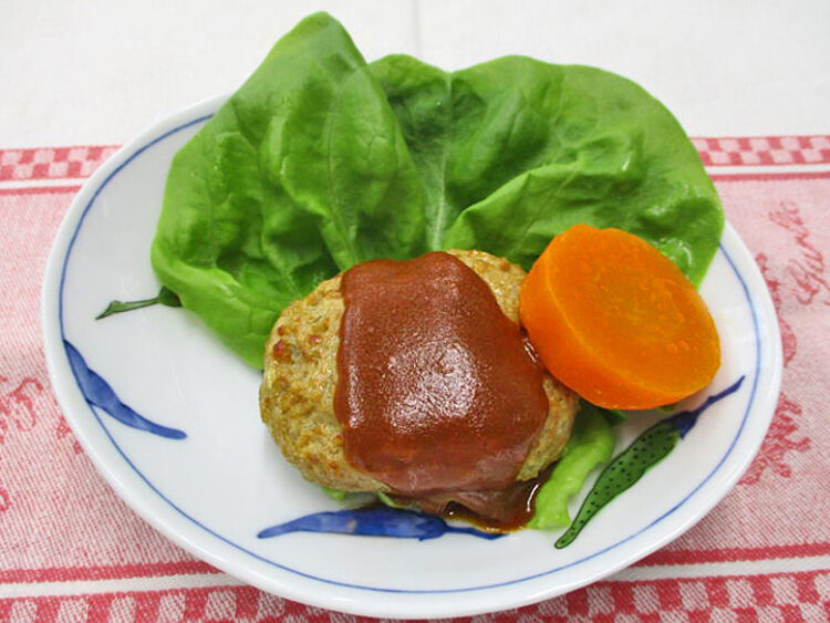 ご飯、キャベツスープ、ハンバーグデミソース、ほうれん草とコーンのソテー、青森県産ごぼうのサラダ、かつおたくあん漬、ジョア